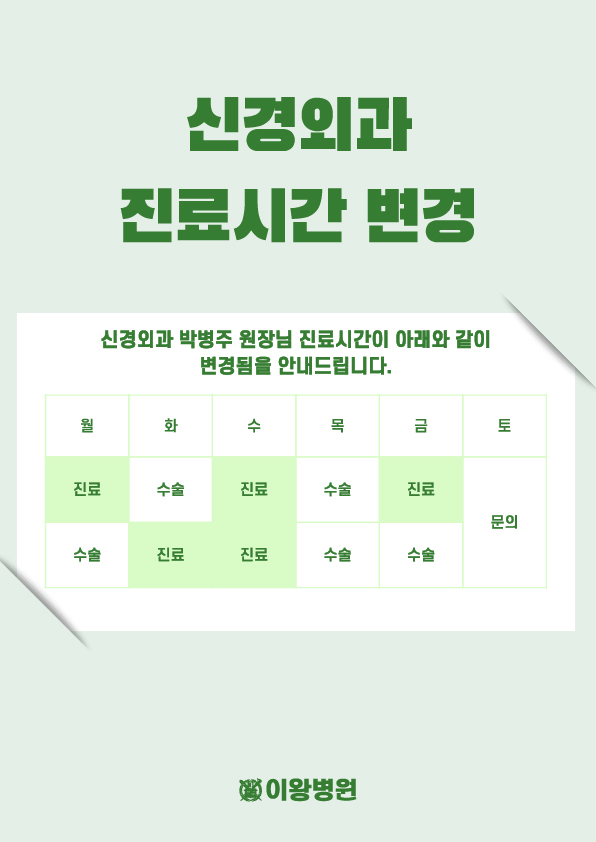 이왕병원 신경외과 박병주 원장님 진료시간이 아래와 같이 변경되어 실시되오니